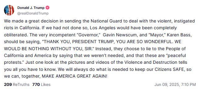 "Мы приняли отличное решение, направив Национальную гвардию для подавления жестоких, спровоцированных беспорядков в Калифорнии. Если бы мы этого не сделали, Лос-Анджелес был бы полностью уничтожен. Крайне некомпетентные "губернатор" Гэвин Ньюсом и "мэр" Карен Басс должны были бы сказать: "Спасибо, президент Трамп, вы так великолепны. Мы – ничто без вас, сэр". Вместо этого они предпочитают лгать народу Калифорнии и всей Америки, утверждая, что наша помощь была не нужна, а это якобы "мирные протесты". Достаточно одного взгляда на фото и видео с насилием и разрушениями, чтобы всё понять. Мы всегда будем делать всё необходимое, чтобы наши граждане были в безопасности, чтобы мы могли вместе снова сделать Америку великой!" – написал президент США.