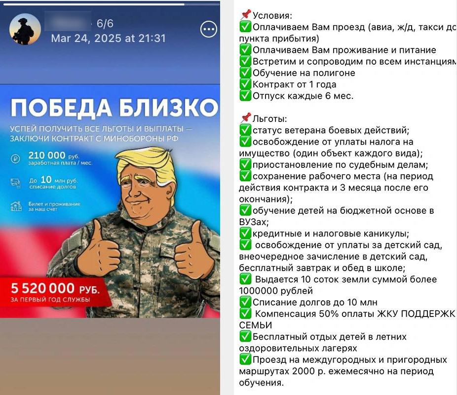 Иногда вербовщики обещают тем, кто согласился подписать контракт, помочь с переводом на тыловую должность или в операторы БпЛА, хотя и уточняют, что гарантий нет. Другие рекрутеры убеждают мужчин в том, что "победа близка" и нужно успеть получить все льготы. Многие говорят, что оплатят билеты на поезд и самолёт, жильё и трёхразовое питание на время прохождения медкомиссии — для этого достаточно согласия приехать и подписать контракт.