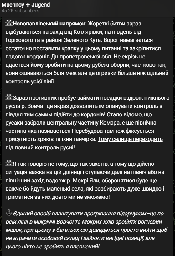 "Ситуация тяжелая на этом участке и шагая дальше на север или на северо-запад вдоль р. Мокрые Ялы, обороняться будет еще труднее, потому что идут маленькие села, которые разбирают очень быстро и держаться за них долго мы не сможем!" - написал Мучной.