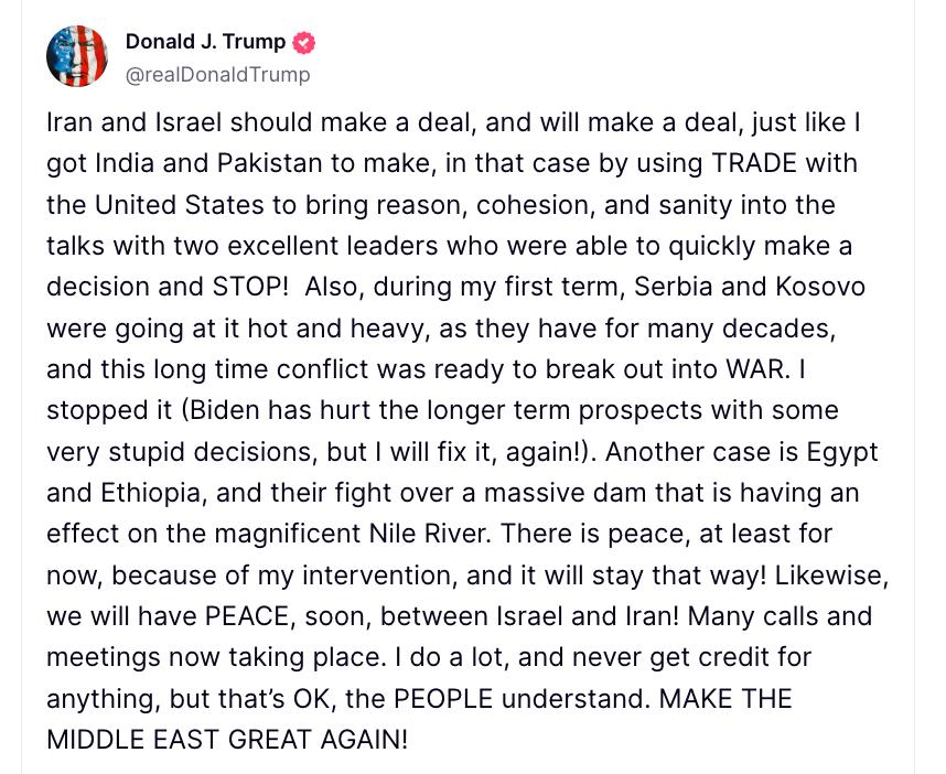 "Точно так же, скоро у нас будет мир между Израилем и Ираном! Сейчас проходит множество звонков и встреч. Я много делаю и никогда ни за что не получаю похвалы, но это нормально, люди поймут. Сделаем Ближний Восток снова великим!" - заключил Трамп.