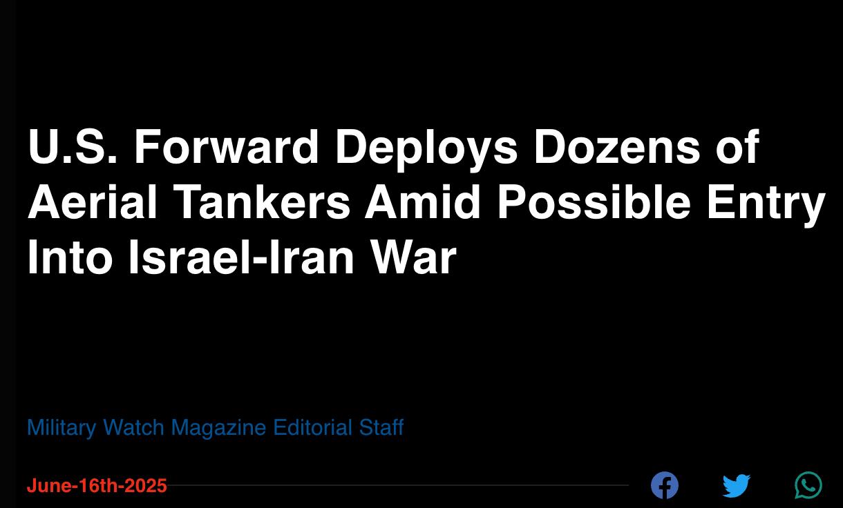 9.40 США перекидывают свои самолеты-заправщики через Атлантический океан в "беспрецедентно массовом" масштабе, возможно, для участия в войне Израиля и Ирана, сообщает Military Watch Magazine