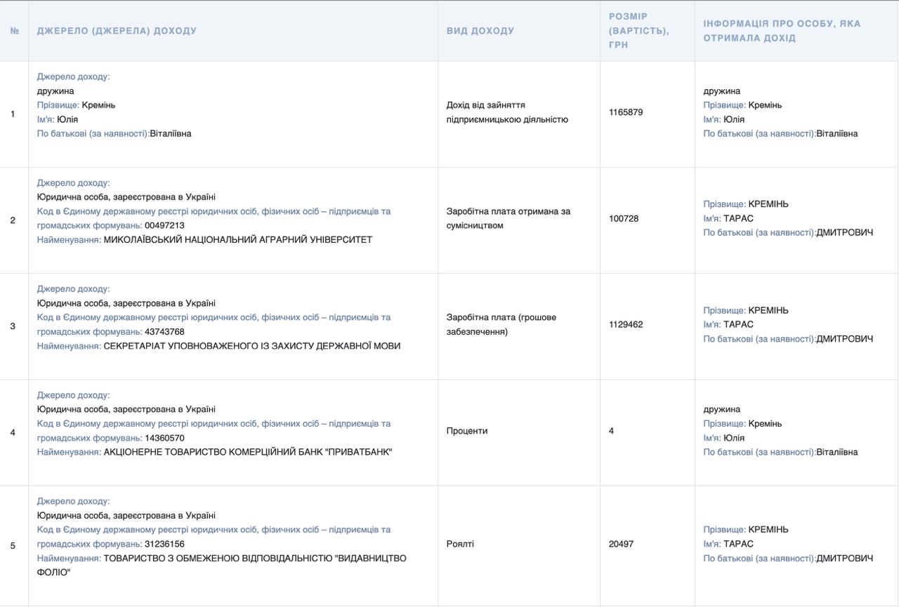 При этом в своей декларации о доходах за 2024 год Креминь указал зарплату в 1,1 миллиона гривен - то есть около 94 тысяч гривен в месяц.