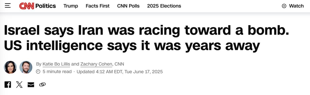 "В то время как американские спецслужбы и МАГАТЭ оценивают ущерб, нанесенный Израилем ядерным объектам Ирана, существуют опасения, что этот удар может подтолкнуть Иран к тому, чего, по мнению американских чиновников, он до сих пор не делал: к созданию ядерного оружия", - резюмирует CNN.
