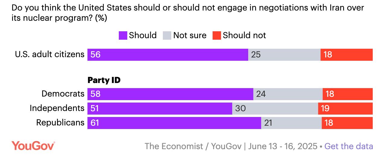 56% считают, что США должны вести переговоры с Ираном по его ядерной программе. Эта позиция получила поддержку как среди демократов (58%), так и среди республиканцев (61%). Независимые оказались менее однозначны, но и среди них большинство - 51% - выступают за переговоры.