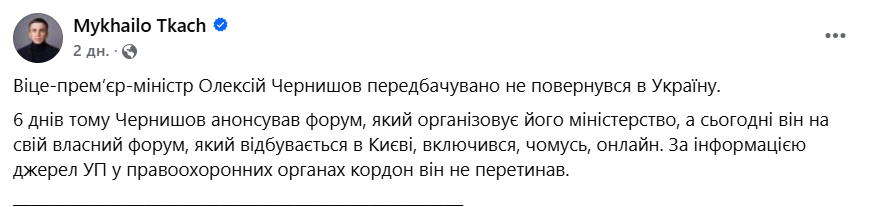 "Вице-премьер Чернышов, как и ожидалось, не вернулся в Украину. 6 дней назад Чернышов анонсировал форум, который организует его министерство, а на свой собственный форум, который проходил в Киеве (17 июня - Ред.) включился, почему-то, онлайн. По информации источников в правоохранительных органах, границу он не пересекал", - пишет Ткач.