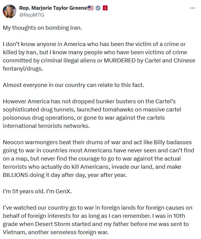 "Неоконсерваторы-поджигатели войны бьют в барабаны войны и ведут себя как крутые парни Билли, отправляясь воевать в страны, которые большинство американцев никогда не видели и не могут найти на карте", – раскритиковала она тех, кто поддерживает удары по Ирану.