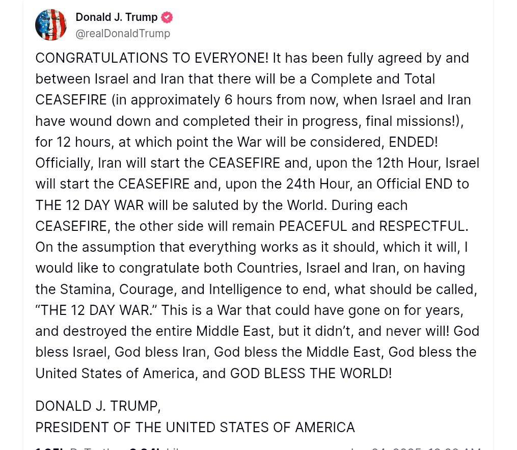 "ПОЗДРАВЛЕНИЯ ВСЕМ! Было полностью согласовано между Израилем и Ираном: будет объявлено ПОЛНОЕ И ТОТАЛЬНОЕ ПРЕКРАЩЕНИЕ ОГНЯ (примерно через 6 часов, когда Израиль и Иран завершат свои текущие финальные миссии!), сроком на 12 часов, после чего ВОЙНА БУДЕТ СЧИТАТЬСЯ ЗАВЕРШЁННОЙ! Официально, прекращение огня начнёт Иран, и по прошествии 12-го часа - Израиль, а по истечении 24 часов всему миру будет торжественно объявлено об ОФИЦИАЛЬНОМ ЗАВЕРШЕНИИ 12-ДНЕВНОЙ ВОЙНЫ. В течение каждого прекращения огня противоположная сторона обязуется сохранять МИР и УВАЖЕНИЕ. При условии, что всё пойдёт, как должно (а так и будет), я хочу поздравить обе страны - Израиль и Иран - с выдержкой, мужеством и разумом, позволившими положить конец тому, что можно назвать "12-ДНЕВНАЯ ВОЙНА". Это была война, которая могла продолжаться годами и разрушить весь Ближний Восток - но этого не произошло и не произойдёт! Да благословит Бог Израиль, да благословит Бог Иран, да благословит Бог Ближний Восток, да благословит Бог Соединённые Штаты Америки, и ДА БЛАГОСЛОВИТ БОГ ВЕСЬ МИР!", - написал он.