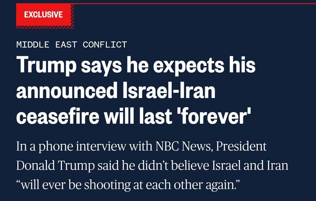 В комментарии телеканалу NBC News Трамп заявил, что ожидает, что объявленное им прекращение огня между Израилем и Ираном будет "вечным".
