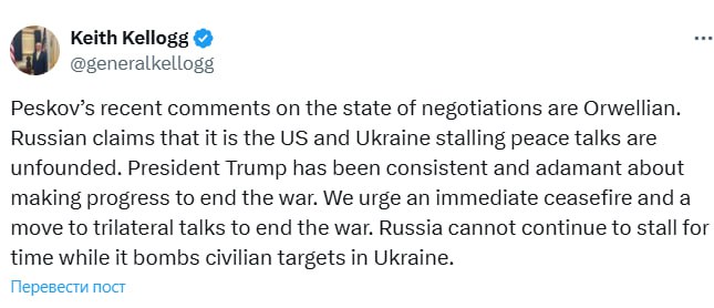 "Недавние комментарии Пескова о состоянии переговоров – оруэлловские. Российские заявления о том, что это США и Украина тормозят мирные переговоры, не обоснованы. Президент Трамп был последователен и непреклонен в достижении прогресса в прекращении войны. Мы призываем к немедленному прекращению огня и переходу к трехсторонним переговорам для прекращения войны. Россия не может продолжать тянуть время, пока она бомбит гражданские объекты в Украине", – заявил спецпредставитель президента США.