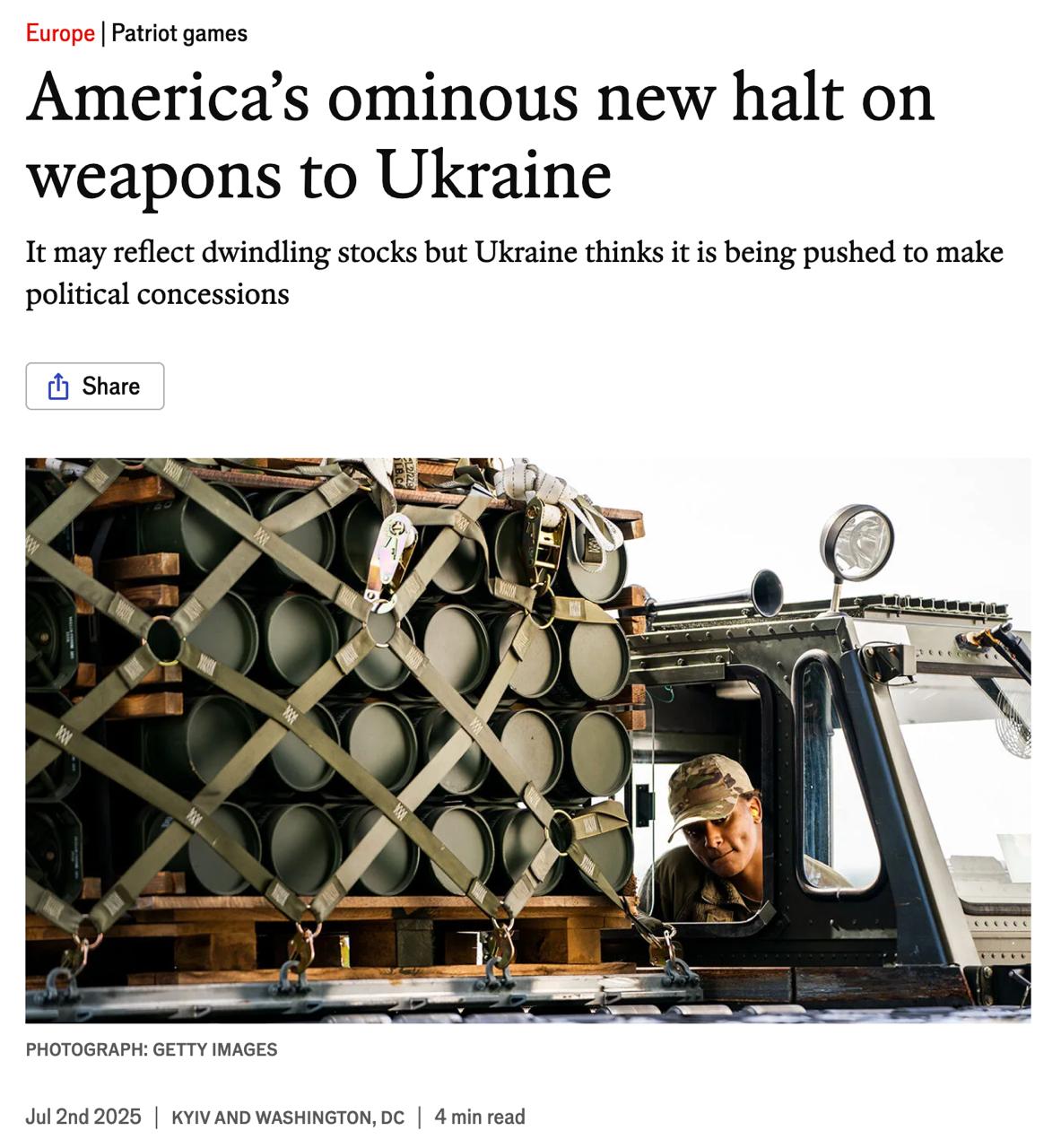 "Украинские официальные лица утверждают, что фактически были остановлены все поставки американского оружия, включая снаряды и запчасти, — это заявление отрицается американскими властями. Чиновники уточнили, что пересмотр носит глобальный характер и любая приостановка в перспективе может быть отменена", - говорится в статье.