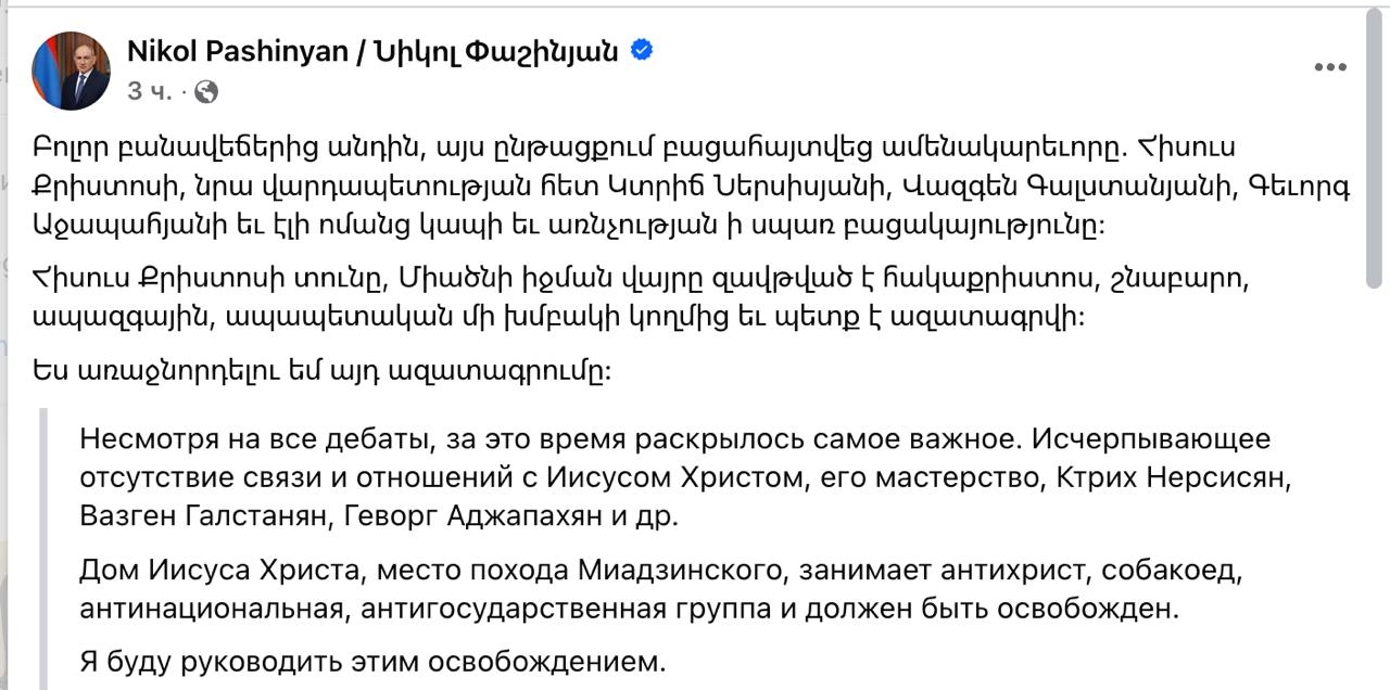 "За пределами всех дебатов за это время было выявлено самое главное: полное отсутствие связи и соприкосновения Ктрича Нерсисяна (мирское имя католикоса Гарегина II - Ред.), Вазгена Галстаняна (мирское имя архиепископа Баграта - Ред.), Геворга Аджапахьяна (мирское имя архиепископа Михаила - Ред.) и некоторых других с Иисусом Христом и его учением. Дом Иисуса Христа, место нисхождения единородного (монастырский комплекс первопрестольный святой Эчмиадзин, духовный и административный центр Армянской апостольской церкви - Ред.), захвачен антихристом, собаковедом, развратной, антинациональной, антигосударственной группировкой и должен быть освобождён. Я буду возглавлять это освобождение", - написал Пашинян.