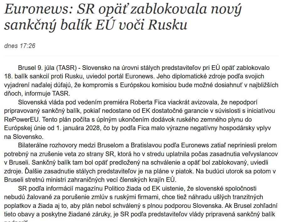 Напомним, премьер Словакии Роберт Фицо говорил, что Братислава будет просить Европейский совет отложить голосование за 18-й пакет антироссийских санкций. По его мнению, проблема с очередным пакетом заключается в отказе от российского газа, поскольку это нанесет ущерб словацкой промышленности.