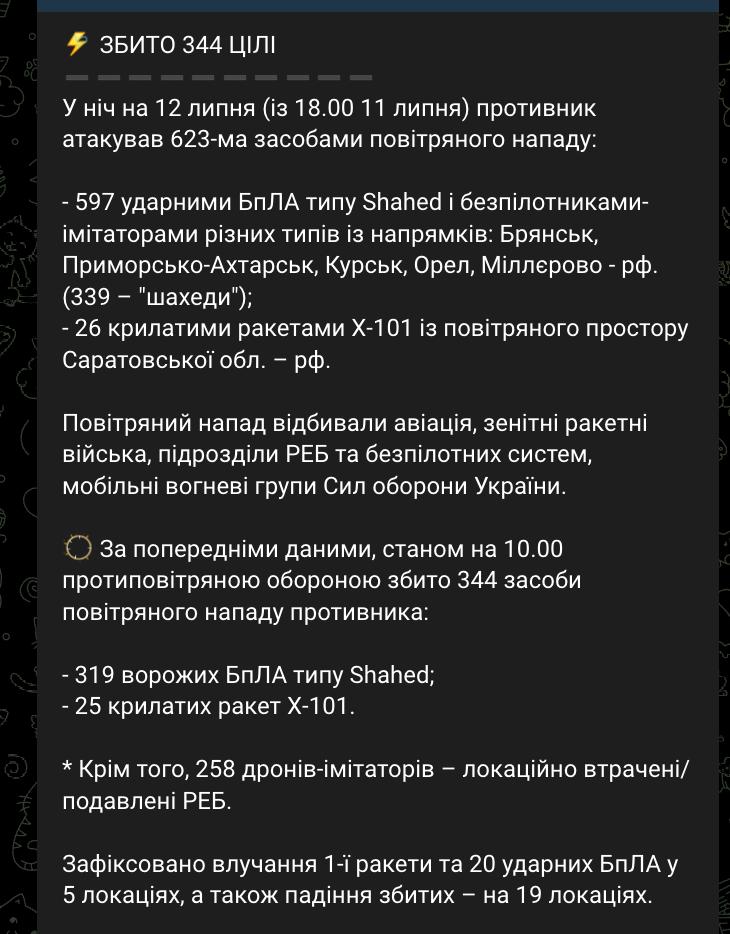 Заявляется, что было попадание одной ракеты и 20 беспилотников в пяти локациях. Также обломки упали на 19 локациях.