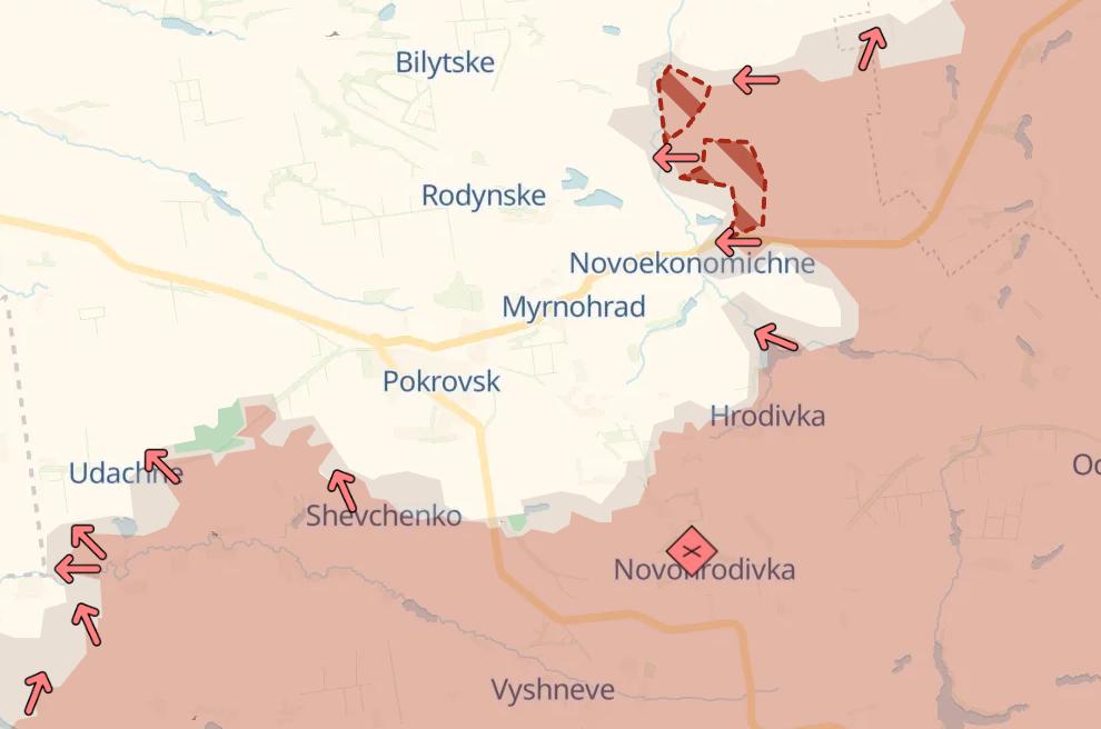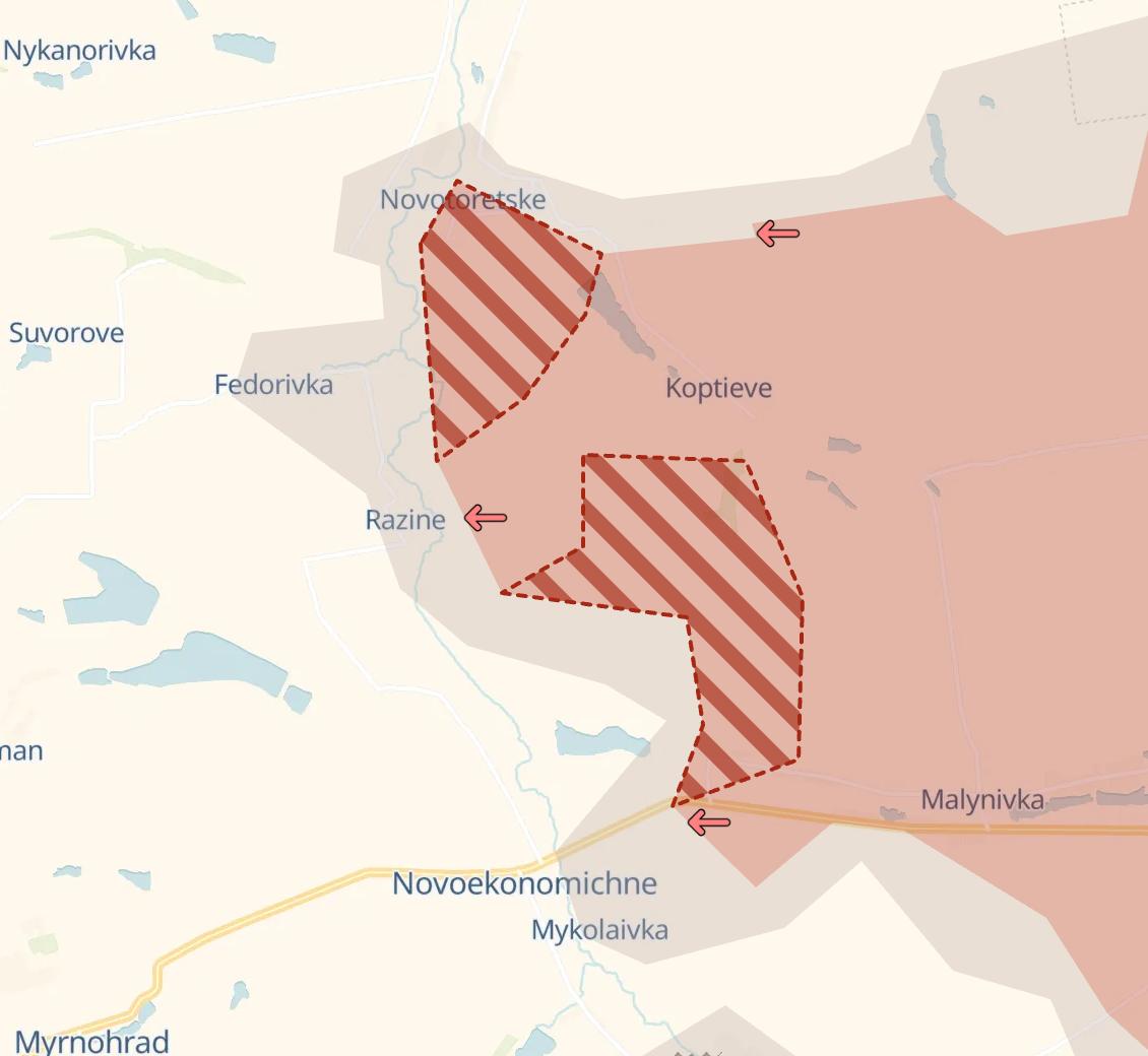 Крупное продвижение у РФ к северо-востоку от Покровска и Мирнограда (по линии Новоторецкое - Новоэкономическое) - с вероятной попыткой выйти к северу от Покровска.