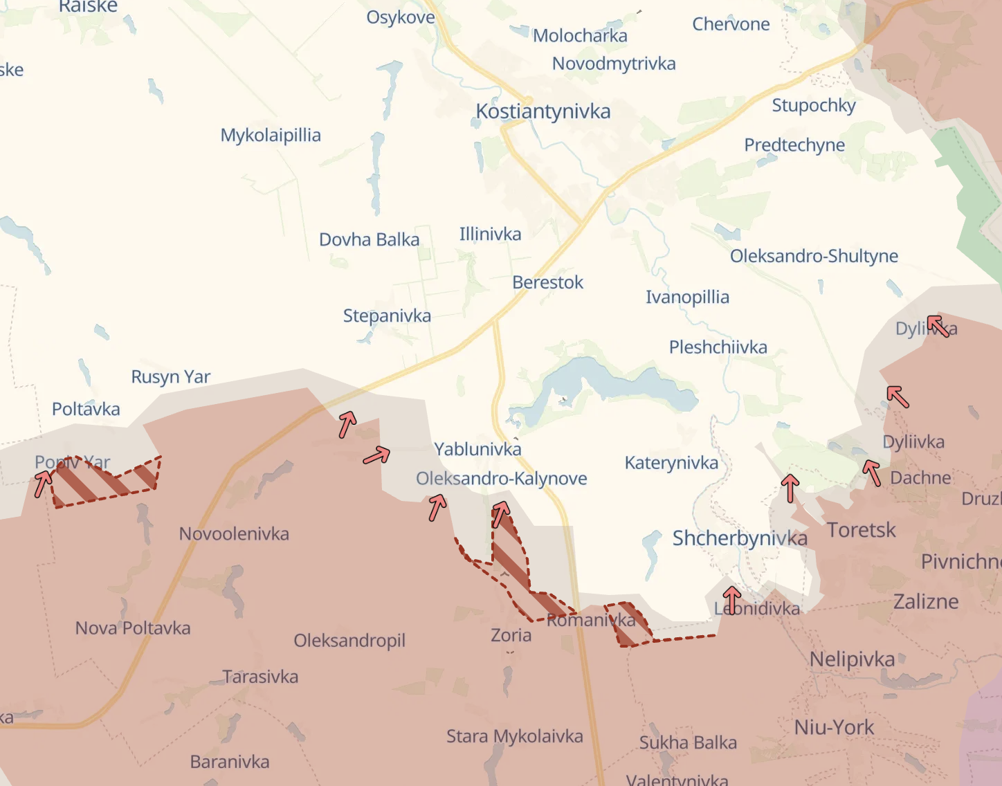 К югу от Константиновки российские силы продвинулись в сторону Александро-Калинового, а также в Романовке и Поповом Яре. Также зафиксировано продвижение в районах Дылеевки и Торецка.