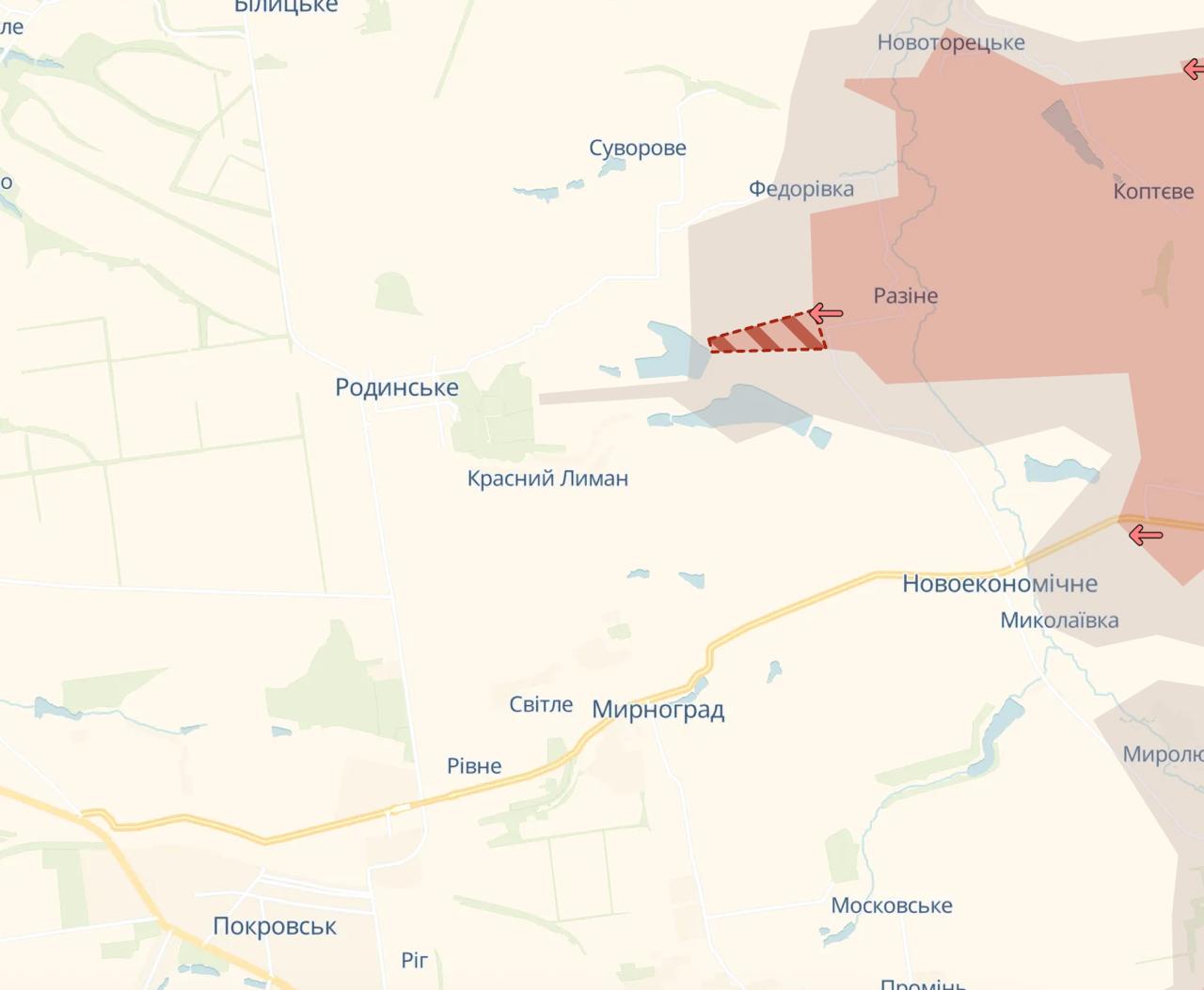 8.24 Россияне снова продвинулись к северу от Мирнограда, со стороны Разино, где серая зона подошла к городу Родинское.
