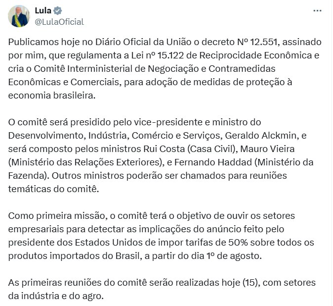 "В качестве первой задачи комитет выслушает предпринимателей, чтобы определить последствия объявления президентом США тарифов в размере 50% на все товары, импортируемые из Бразилии", - написал Лула да Силва.