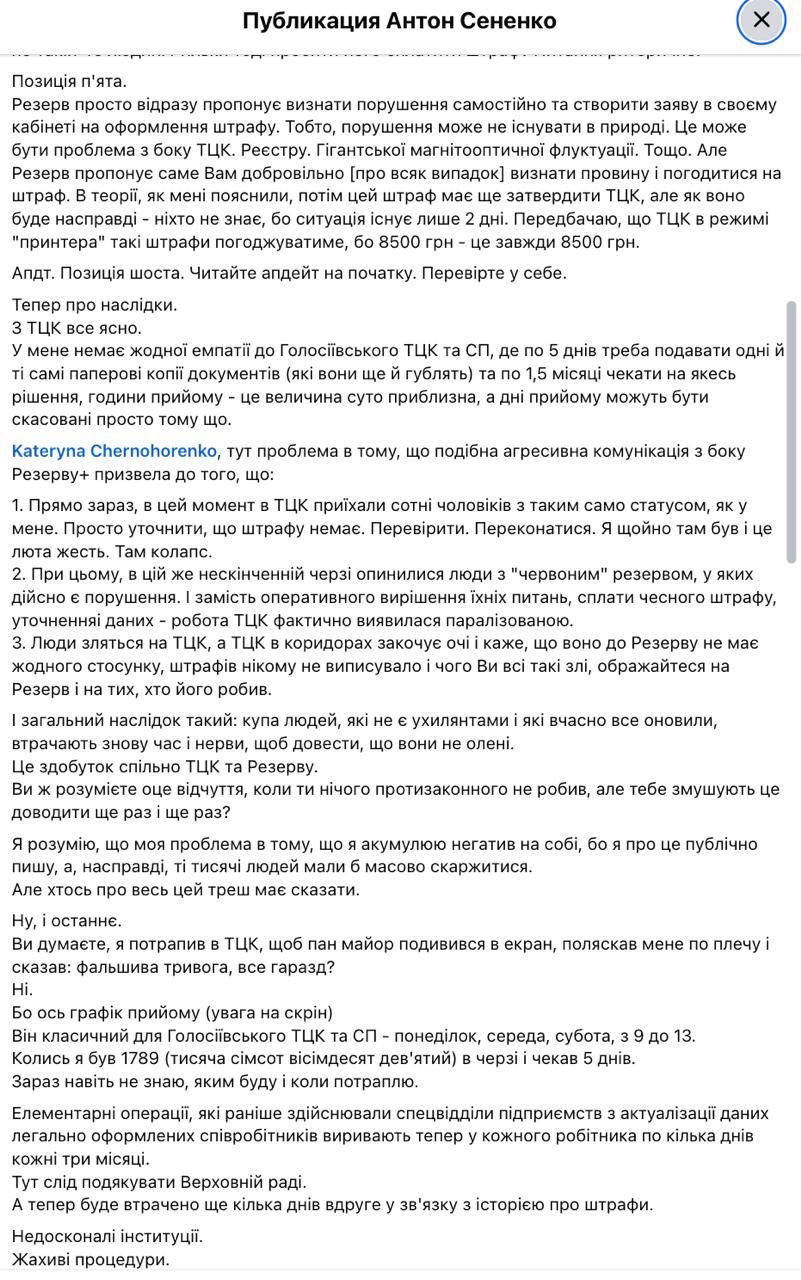 "Часы приема - это величина сугубо приблизительная, а дни приема могут быть отменены просто потому что. Прямо сейчас, в этот момент в ТЦК приехали сотни мужчин с таким же статусом, как у меня. Просто уточнить, что штрафа нет. Проверить. Убедитесь. Я только что там был и это лютая жесть. Там коллапс", - пишет он.
