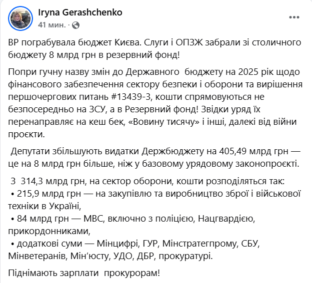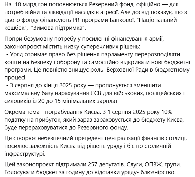 Средства пойдут в Резервный фонд, "откуда правительство перенаправляет их на кэшбэк, "Вовину тысячу" и другие, далекие от войны проекты", пишет депутат.