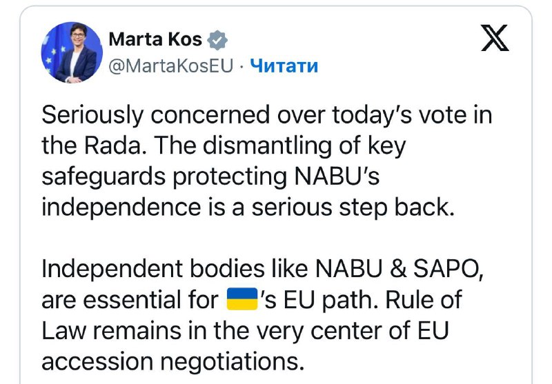 "Серьёзно обеспокоена сегодняшним голосованием в Раде. Отмена ключевых гарантий, защищающих независимость НАБУ, является серьёзным шагом назад. Независимые органы, такие как НАБУ и САП, необходимы для пути Украины в ЕС. Верховенство закона остаётся в самом центре переговоров о вступлении в ЕС", - написала Кос.