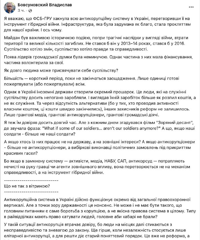 "Я считаю, что ФСБ-ГРУ хакнула всю антикоррупционную систему в Украине, превратив ее в инструмент гибридной войны. Инфраструктура, которая была задумана как благо, стала проклятием нашей страны", - полагает Бовсуновский.