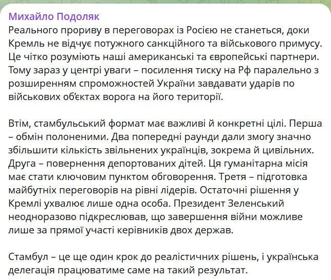 "Стамбульский формат имеет важные и конкретные цели. Первая – обмен пленными. Два предыдущих раунда позволили значительно увеличить количество освобождённых украинцев, в том числе и гражданских. Вторая – возвращение депортированных детей. Эта гуманитарная миссия должна стать ключевым пунктом обсуждения. Третья – подготовка будущих переговоров на уровне лидеров. Окончательные решения в Кремле принимает только один человек. Президент Зеленский неоднократно подчеркивал, что завершение войны возможно только при прямом участии руководителей двух государств. Стамбул – это еще один шаг к реалистичным решениям, и украинская делегация будет работать именно на такой результат", – написал Подоляк.