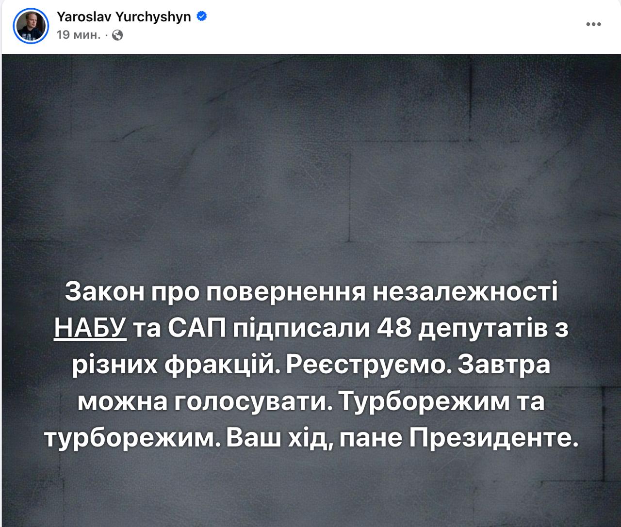 Об этом сообщает народный депутат Ярослав Юрчишин.