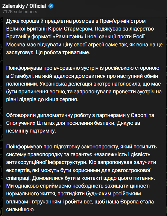 Президент Владимир Зеленский обговорил с премьер-министром Великобритании Киром Стармером новый законопроект, который "гарантирует независимость" НАБУ.