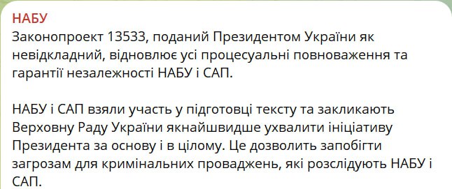 "НАБУ и САП приняли участие в подготовке текста и призывают Верховную Раду Украины поскорее принять инициативу президента за основу и в целом. Это позволит предотвратить угрозы для уголовных производств, которые расследуют НАБУ и САП", – сообщило Бюро.