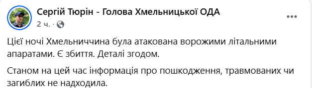 "Этой ночью Хмельнитчина была атакована вражескими летательными аппаратами. Есть ущерб. Детали впоследствии", - написал он.
