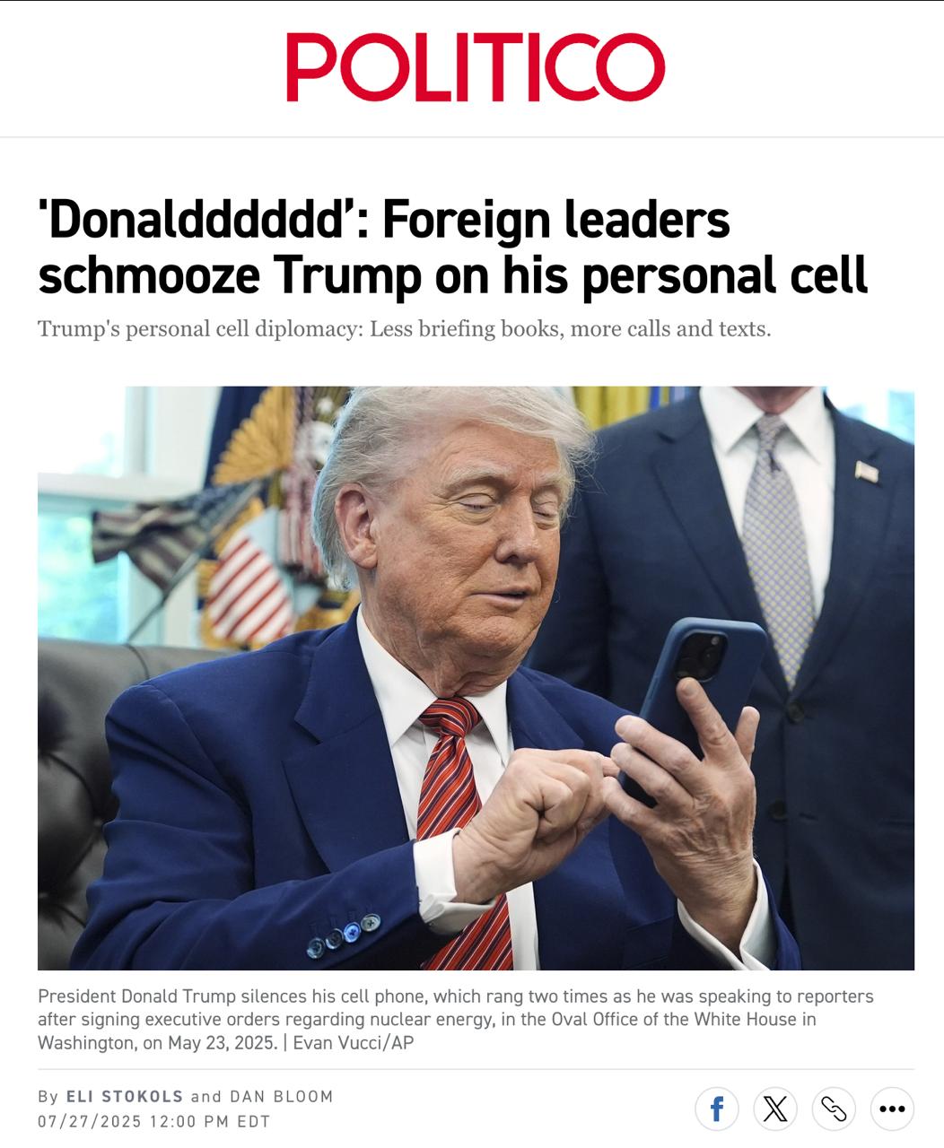 Мировые лидеры, желающие сохранить благосклонность Трампа, регулярно звонят ему и пишут сообщения. При этом иногда Трамп показывает фрагменты своих переписок другим лидерам.