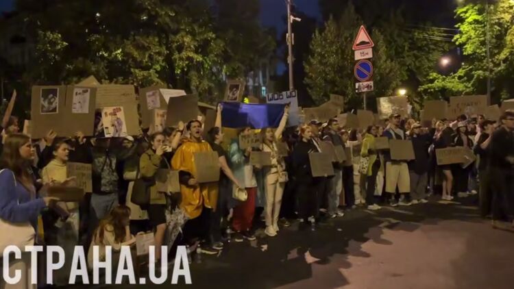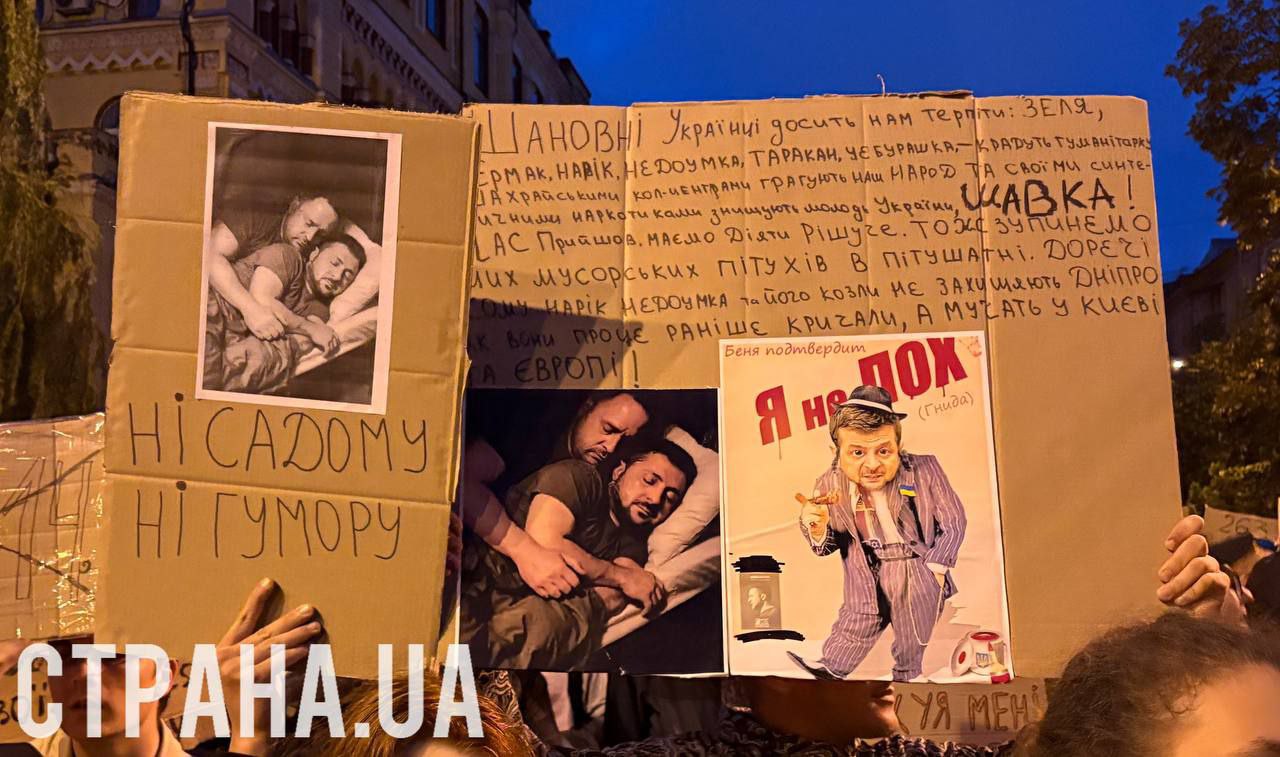 На акцию протеста в поддержку Национального антикоррупционного бюро Украины (НАБУ) под Офисом президента пришли около 10 человек, державших в руках плакаты против президента Владимира Зеленского и главы ОП Андрея Ермака. Они некоторое время находились среди участников митинга, скандируя речёвки так же, как и остальные.