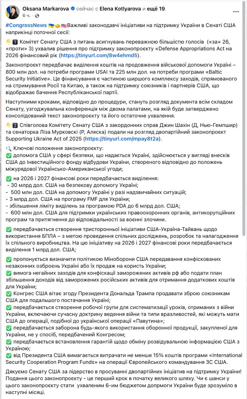 Также Маркарова пишет, что в комитете иностранных дел представили двухпартийный законопроект, которым предлагается выделить Украине в 2026 и 2027 годах 30 млрд долл. на прямую военную помощь, 500 млн на случай чрезвычайных ситуаций, 600 млн на правоохранительные органы, антикоррупционные программы и привлечение к ответственности за военные преступления.