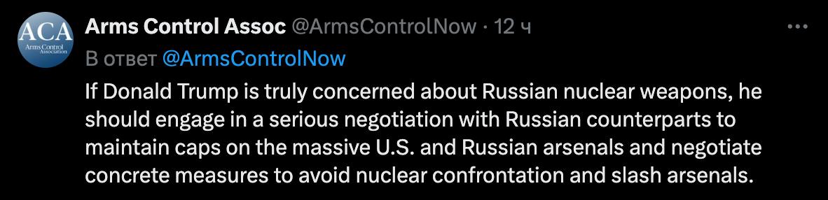 "Если Дональд Трамп действительно обеспокоен российским ядерным оружием, он должен начать серьёзные переговоры с российской стороной с целью сохранить ограничения на огромные арсеналы США и России, а также договориться о конкретных мерах по предотвращению ядерной конфронтации и сокращению ядерных запасов", - добавили эксперты по ядерной безопасности.