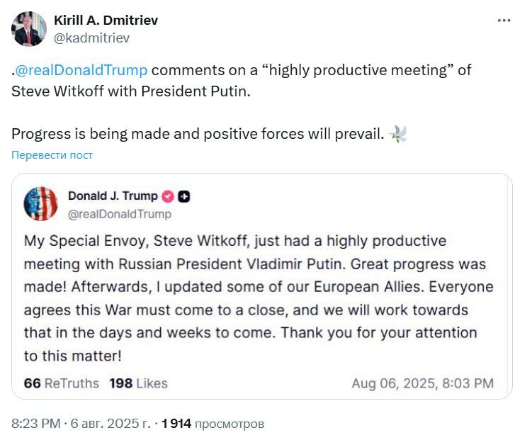 "Прогресс есть, и позитивные силы возобладают", – написал Дмитриев в соцсети X.