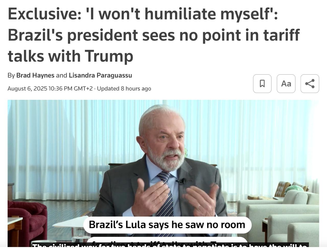 "Мы уже когда-то простили вмешательство США в переворот 1964 года. Но это уже не мелкое вмешательство. Это - президент США считает, что может диктовать условия суверенному государству, такому как Бразилия. Это неприемлемо", - заявил Лула.