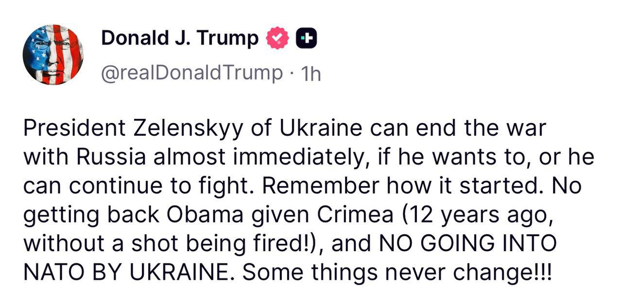 "Президент Украины Владимир Зеленский может практически мгновенно прекратить войну с Россией - если захочет. Или же может продолжать сражаться. Никакого возвращения Крыма, который был отдан Обамой 12 лет назад - без единого выстрела. И никакого вступления Украины в НАТО. Есть вещи, которые не меняются!" - написал Трамп в своей социальной сети Truth Social.
