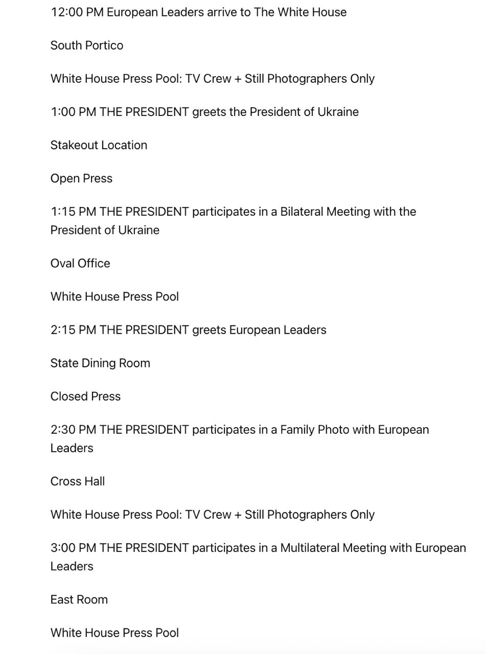 Двусторонняя встреча президентов США и Украины Дональда Трампа и Владимира Зеленского начнётся в 20:15 по Киеву, а беседа в расширенном составе с участием европейских лидеров стартует в 22:00.