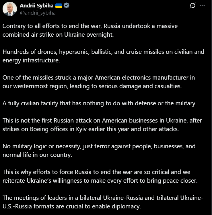 "Одна из ракет поразила крупный американский производитель электроники в нашем самом западном регионе, что привело к серьёзным разрушениям и жертвам. Полностью гражданский объект, не имеющий никакого отношения к обороне или военным операциям", - написал он.