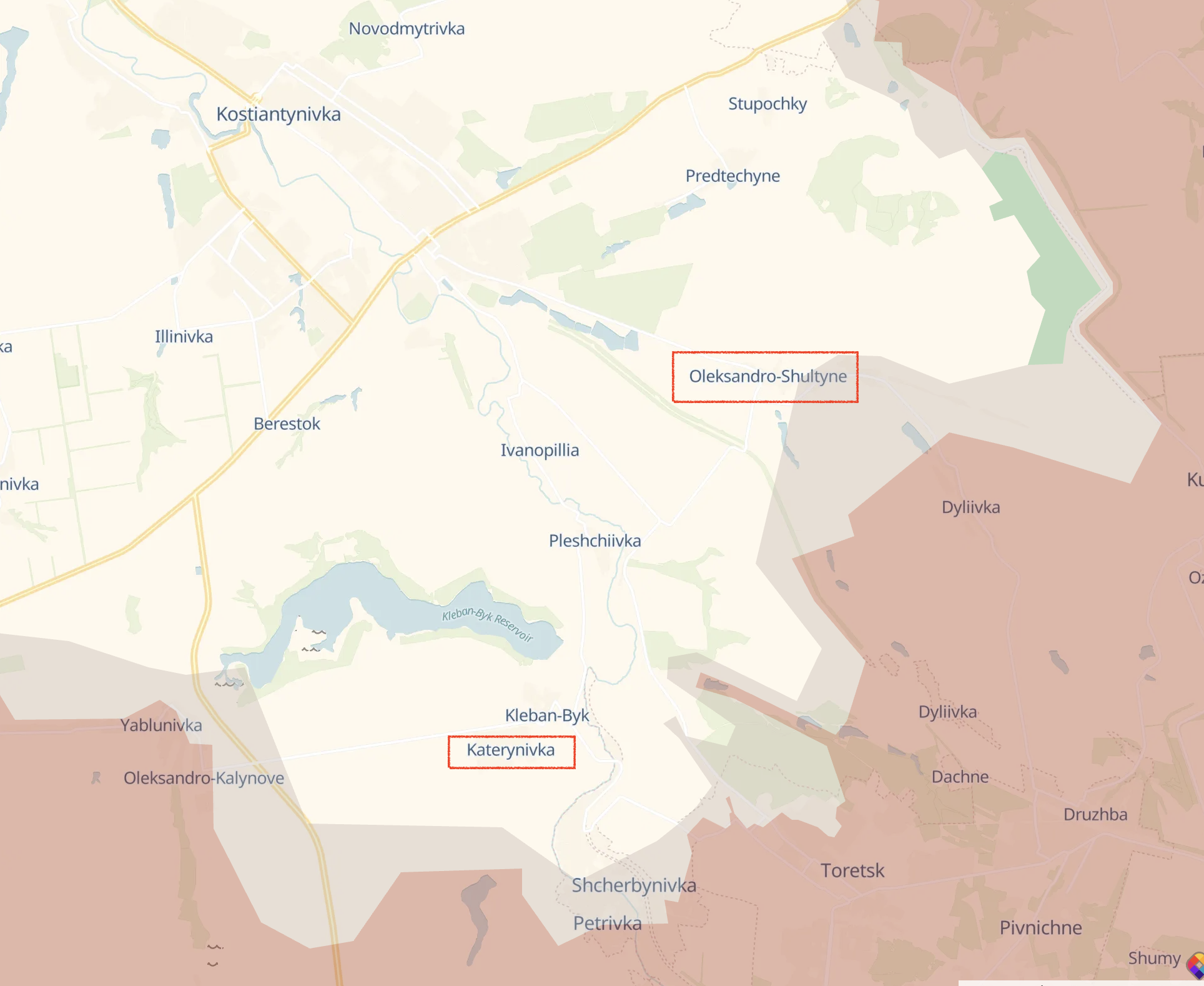 Отметим, что на южных подступах к Константиновке россияне сейчас штурмуют укрепрайон ВСУ по линии Клебан Быка, Щербиновки, Плещеевки и Александро-Шультино. Россия сегодня официально заявила о захвате Александро-Шультино, а также Катериновки под Клебан Быком. Украина этого не подтверждала, как и военные паблики, поддерживающие ВСУ.