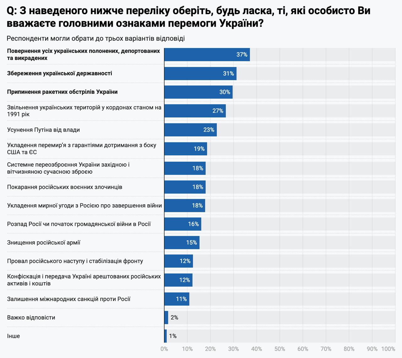При этом многие считают, что победой будет возвращение к границам 1991 года - 27% опрошенных (можно было выбрать несколько пунктов). 30% считают, что победой будет сохранение государственности.