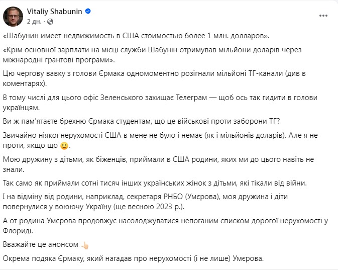 Сам Шабунин в своем Фейсбуке заявил, что информация о его доме в США - фейк. Он обвинил в его запуске главу Офиса президента Андрея Ермака.