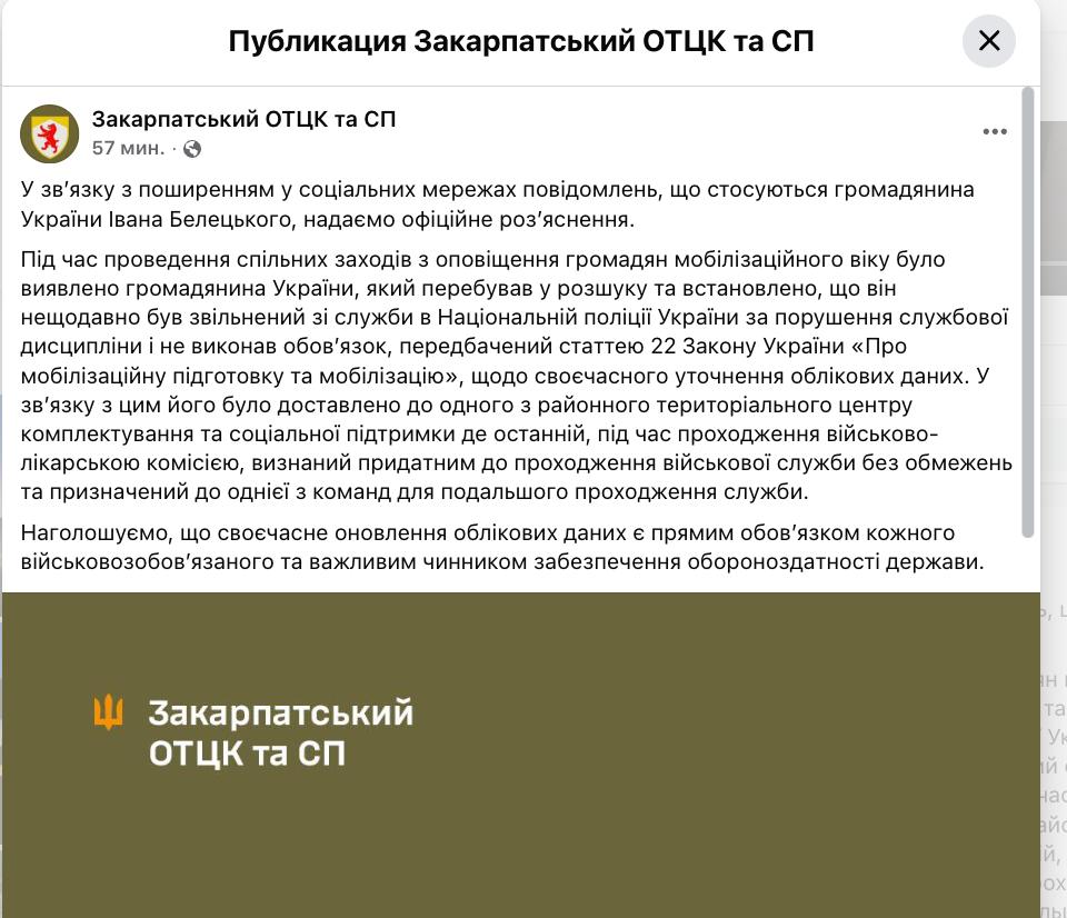 В Ужгороде Иван Белецкий, который был уволен из полиции за помощь, оказанную избитому ТЦК ветерану ВСУ, сам оказался в ТЦК.