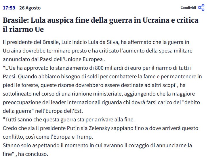 Об этом заявил президент Бразилии Луис Инасиу Лула да Силва, чьи слова приводит RAI News.