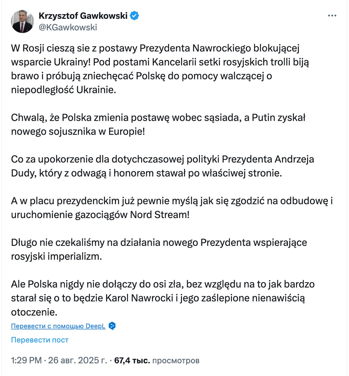 "В России радуются позиции президента Навроцкого, блокирующего поддержку Украины! Под постами Канцелярии сотни российских троллей аплодируют и пытаются отговорить Польшу от помощи борющейся за независимость Украины... Мы недолго ждали действия нового президента в поддержку российского империализма. Но Польша никогда не присоединится к оси зла, независимо от того, как сильно к этому стремятся Кароль Навроцкий и его ослепленное ненавистью окружение", - заявил Гавковский.