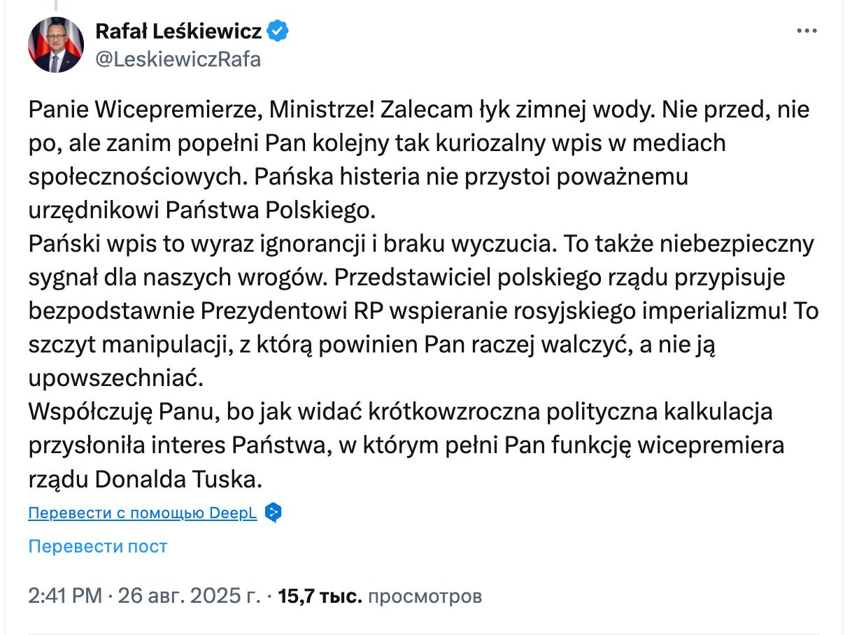 "Это также посылает опасный сигнал нашим врагам. Представитель польского правительства безосновательно обвиняет президента Республики Польша в поддержке российского империализма! Это верх манипуляций, с которыми вам следует бороться, а не оказывать им содействие", - написал Лешкевич.