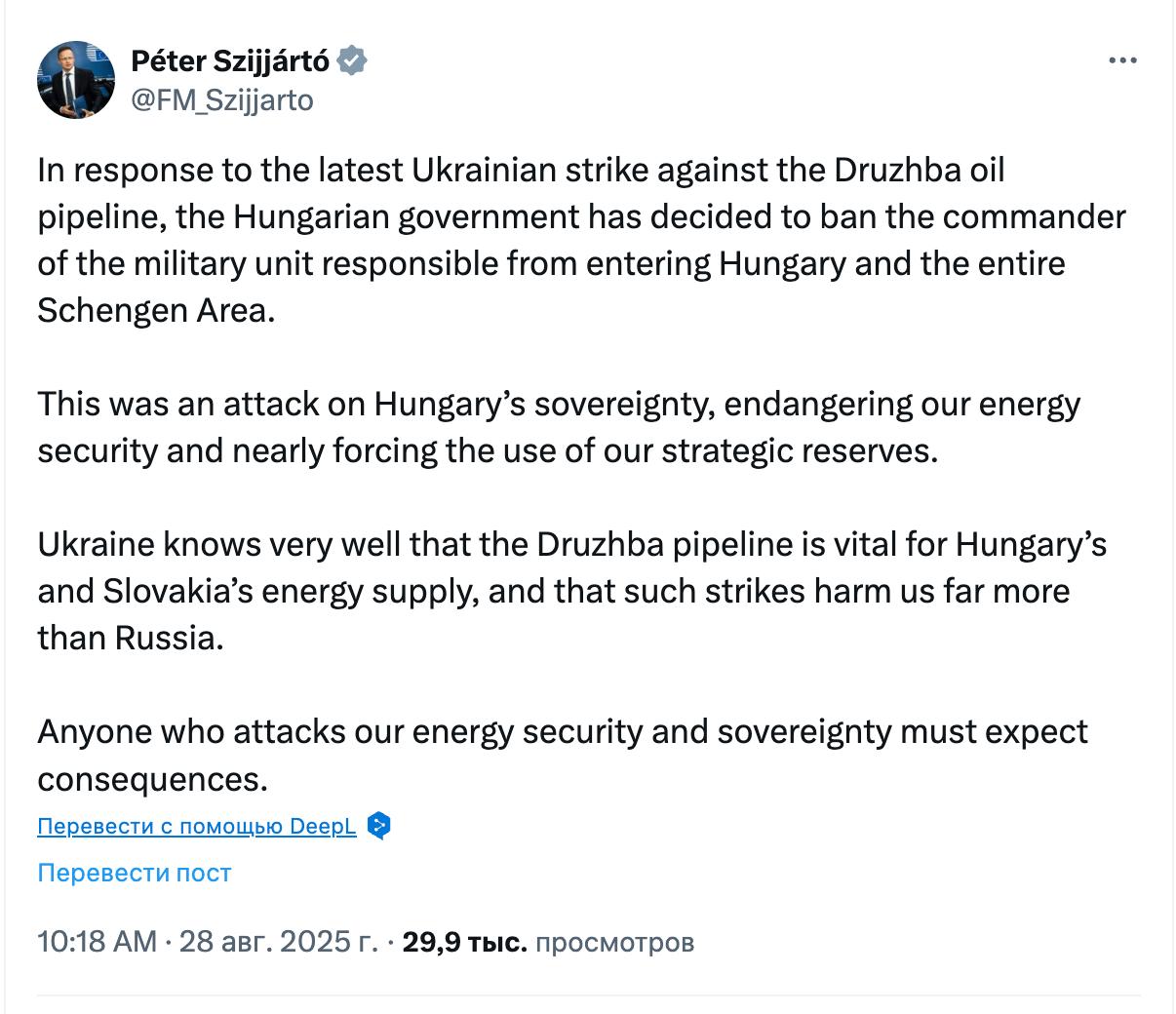 "Это было посягательство на суверенитет Венгрии, поставившее под угрозу нашу энергетическую безопасность и едва не вынудившее нас задействовать стратегические запасы", - пишет Сийярто.
