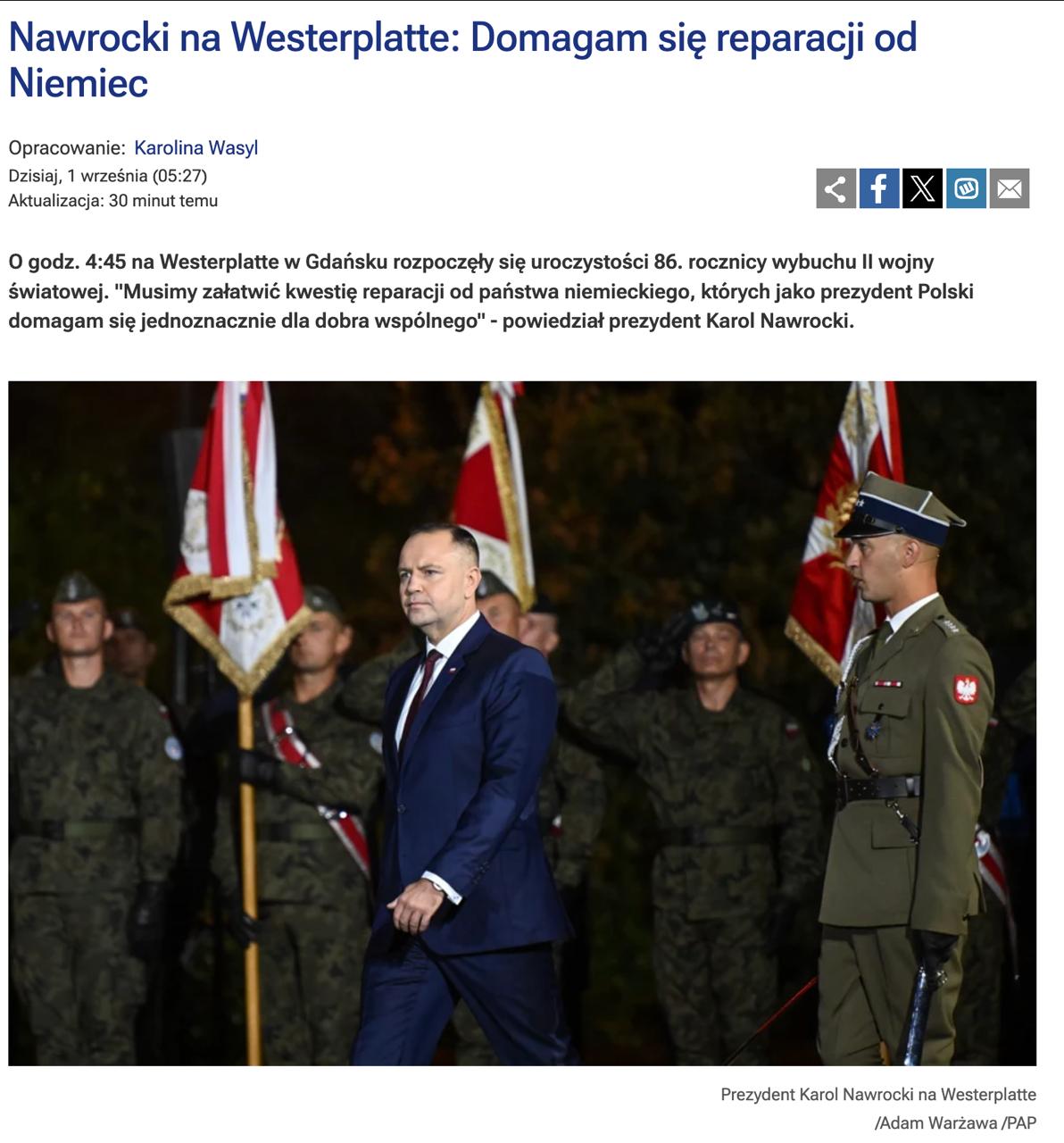 "Чтобы построить партнерство, основанное на принципах правды и добрых отношений, мы должны решить вопрос о репарациях со стороны немецкого государства, которые я, как президент Польши, безоговорочно требую ради общего блага. Репарации не станут альтернативой исторической амнезии, но Польша как прифронтовое государство, как важнейшее государство на восточном фланге НАТО нуждается в справедливости, правде и ясных отношениях с Германией, но ей также нужны репарации от немецкого государства", - заявил Навроцкий на площади Вестерплатте в Гданьске.