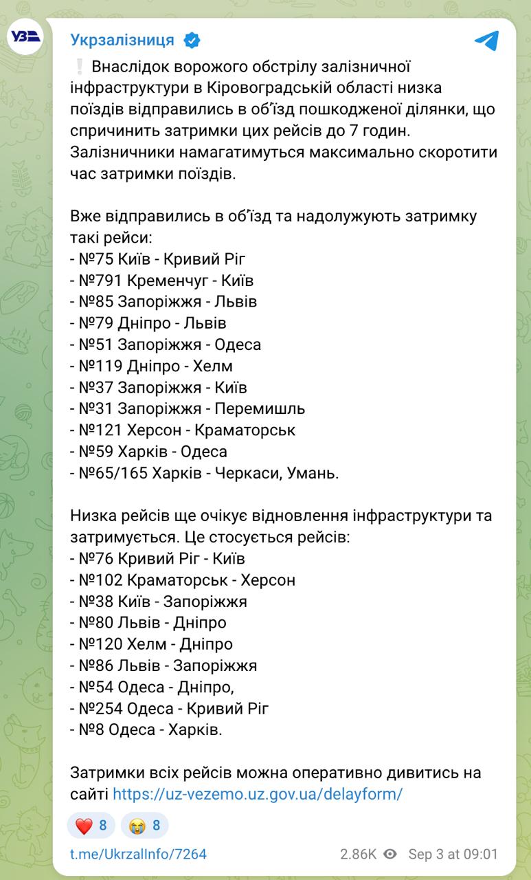 9.06 Задержки поездов из-за удара по железнодорожной инфраструктуры в Кировоградской области уже достигают 7 часов, сообщает Укрзализныця.