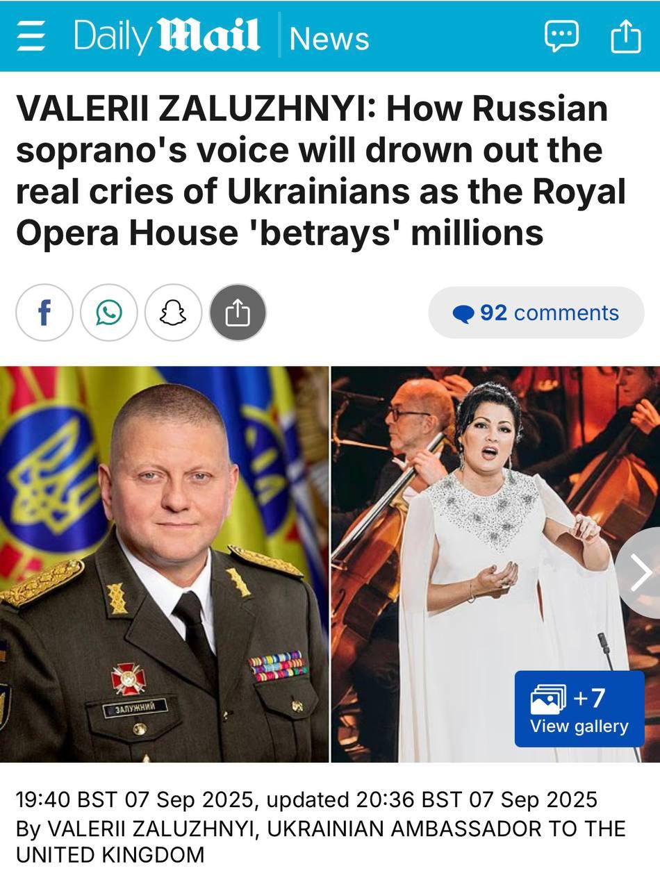 "Она была и остается культурным инструментом, легитимирующим убийства в Украине. На этой неделе она выйдет на сцену Ковент-Гардена, и люди будут аплодировать ей, как будто она всего лишь певица, как будто войны вообще не существует. Я не призываю к цензуре. Я призываю к памяти и честности", - пишет экс-главком.